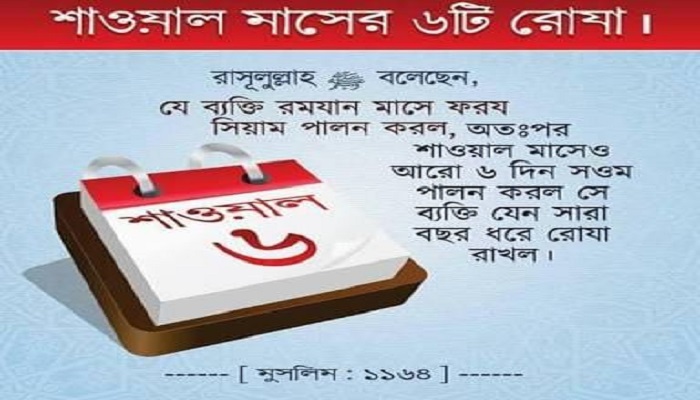 শাওয়াল মাসে ছয়টি রোজা রাখা সম্পর্কে রাসুলুল্লাহ (সা.) বলেন, ‘যারা রমজানে রোজা পালন করবে এবং শাওয়ালে আরও ছয়টি রোজা রাখবে, তারা যেন সারা বছরই রোজা পালন করল’ (মুসলিম, হাদিস: ১১৬৪; আবু দাউদ, হাদিস: ২৪৩৩; তিরমিজি, নাসায়ি, ইবনে মাজাহ, সহিহ্-আলবানি)।